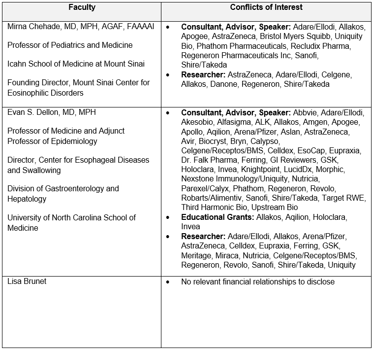 The primary target audience for this activity are clinicians in gastroenterology (pediatric and adult), allergy/immunology, and primary care, including physicians, nurse practitioners, and physician assistants.