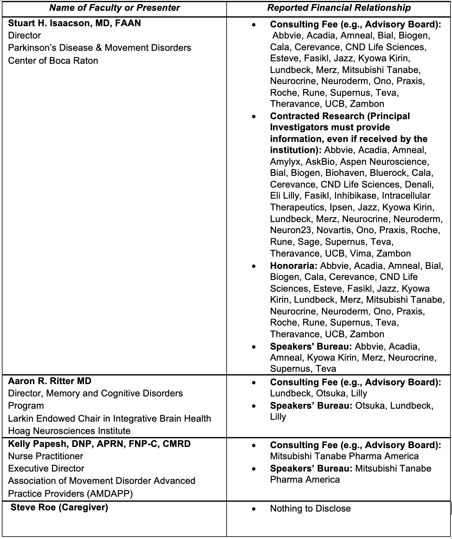 Disclosures of Relevant Financial Relationships