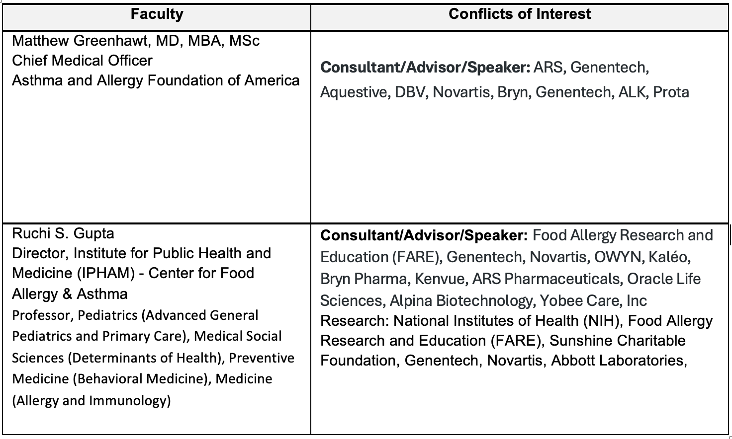Faculty and Disclosure of Conflicts of Interest